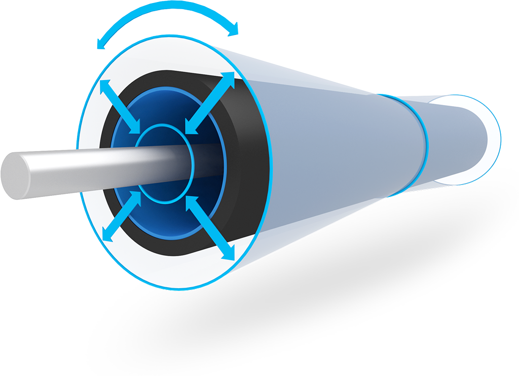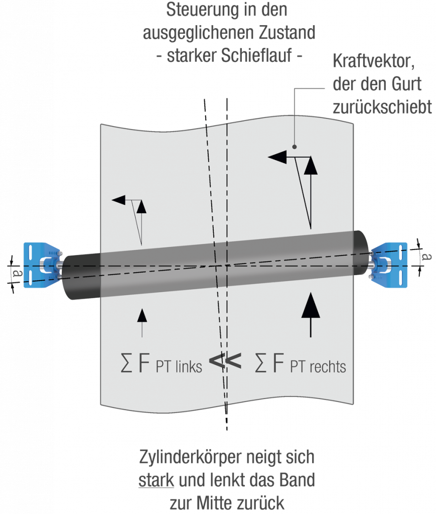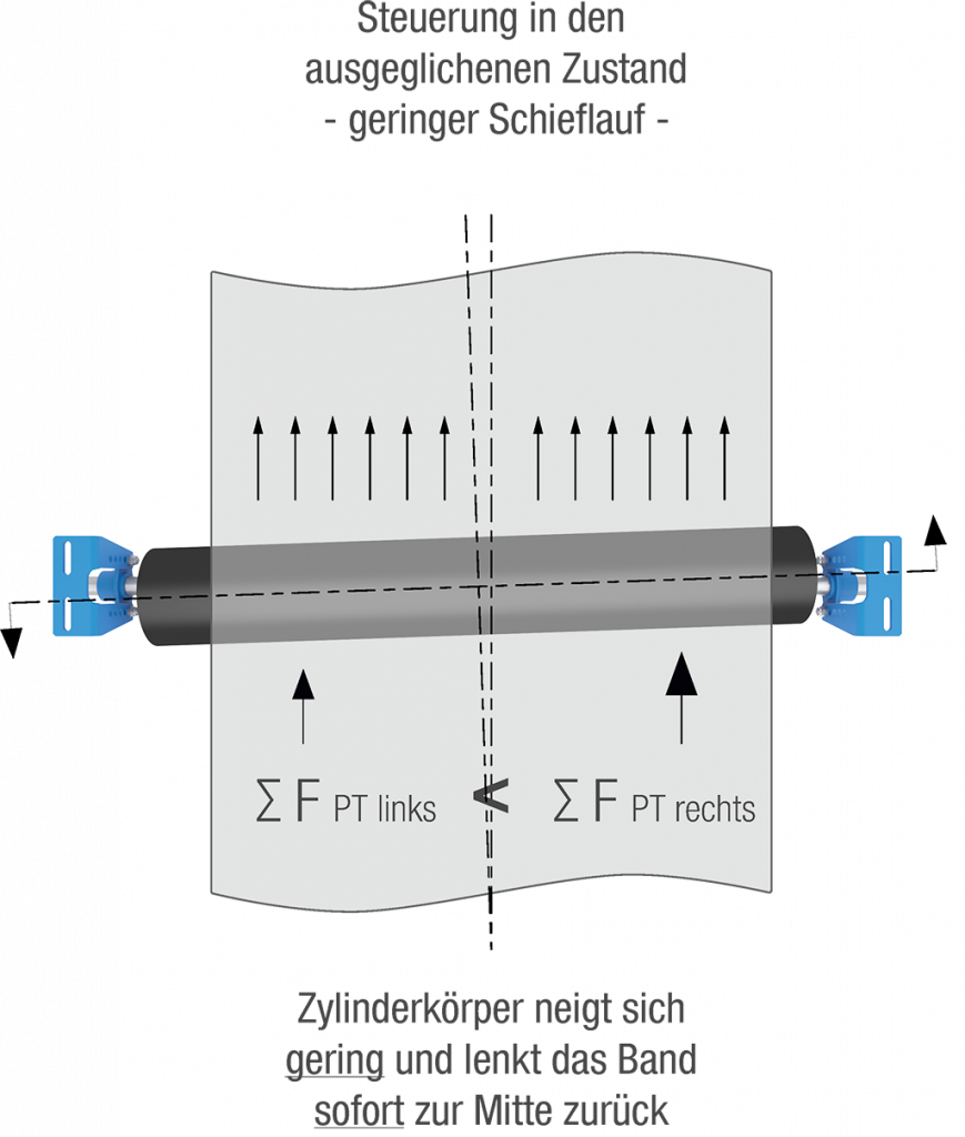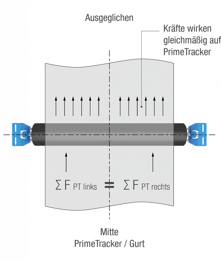 Die speziell entwickelte wartungsfreie Lagerung des PrimeTracker ermöglicht eine Achslagenänderung des rotierenden Laufkörpers in alle Richtungen. Der gummierte Zylinderkörper kann sich neigen und schwenken und lenkt mit leichtem Druck gleichmäßig über die gesamte Kontaktfläche. Der PrimeTracker ist physikalisch so konstruiert, dass er schon geringste Abweichungen des Gurtlaufs von der optimalen Lauflinie erkennt und mit der entsprechenden Gegenkraft reagiert. Die Kraft des PrimeTrackers wird dabei bei einsetzender Steuerung durch die Stärke der Abweichung des Gurtes von der optimalen Gurtlage bestimmt.